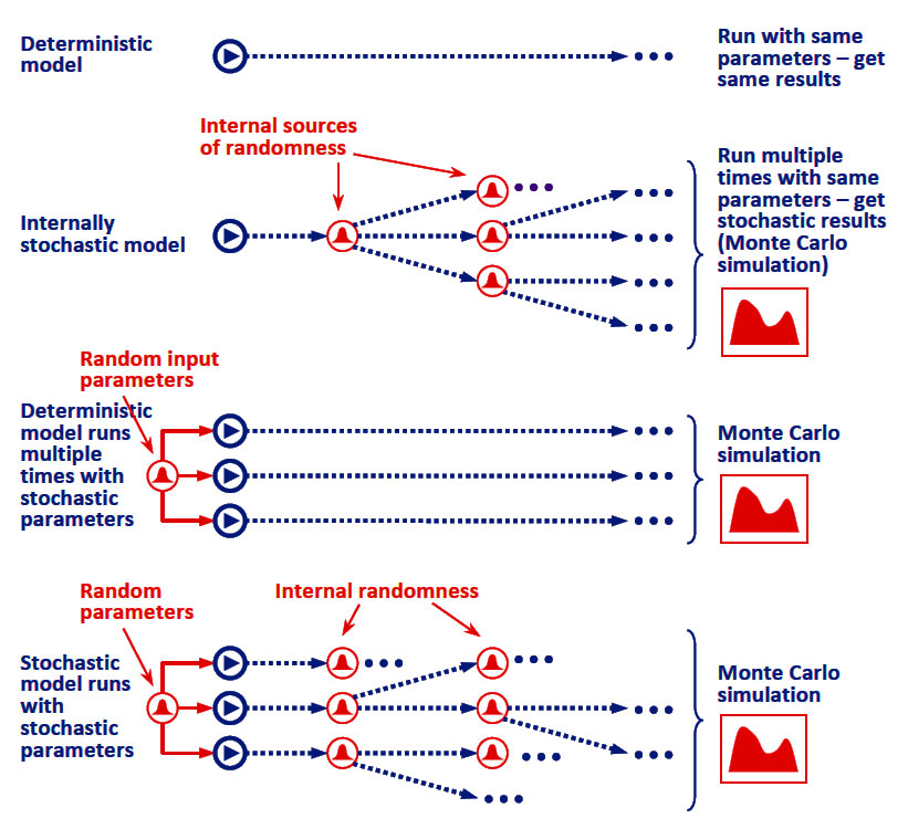 如果你只运行一次随机模型,你就不会得到具有代表性的模拟结果。因此,您需要多次运行它,即使使用相同的输入参数。调用一系列具有随机性的模拟运行(内部的,输入参数级别的,或两者都有)蒙特卡罗模拟.